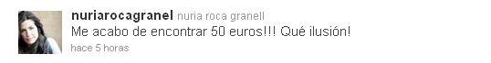 “Es curioso ¿no?”, entre risas pronuncia esta frase Nuria cuando le preguntamos por los 50 euros que anunció, unas horas antes a través de Twitter, haberse encontrado. Y es que este medio de comunicación social le agrada porque según ella “eres el único intermediario entre lo que dices y lo que quieres. Me parece una vía legítima porque es apetecible, si quieres lo haces o no, sin depender de una revista o un photocall. Cuentas lo que te apetece que la gente sepa de ti”.