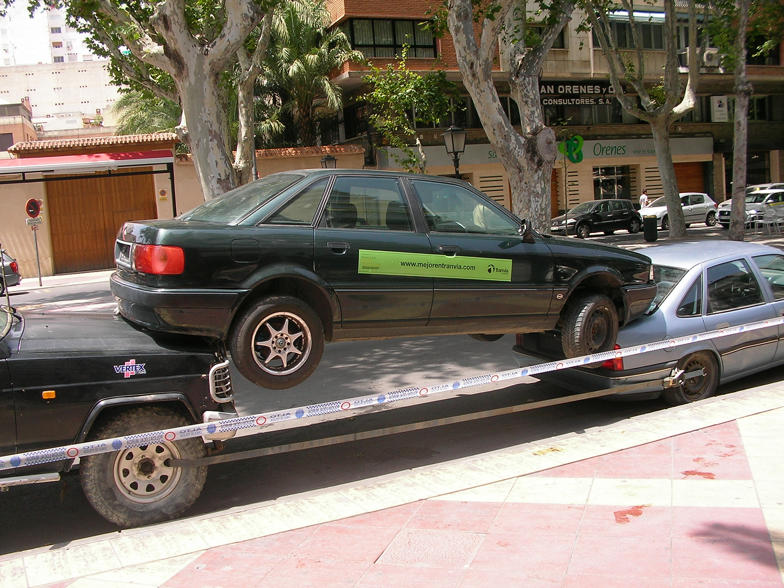 Dos coches sobre otro en el centro de Murcia. No se trata de un aparatoso accidente de tráfico, sino de la campaña ‘Mejor en Tranvía’ promovida por el Ayuntamiento de Murcia. El paseo Alfonso X de la capital murciana, ha sido elegido hoy para mostrar a los viandantes las ventajas del uso del tranvía frente al vehículo tradicional. Mañana esta imagen se podrá contemplar en el Campus de Espinardo de la Universidad de Murcia. Con esta acción publicitaria quieren transmitir la dificultad, a determinadas horas, de aparcar en el centro de la ciudad.