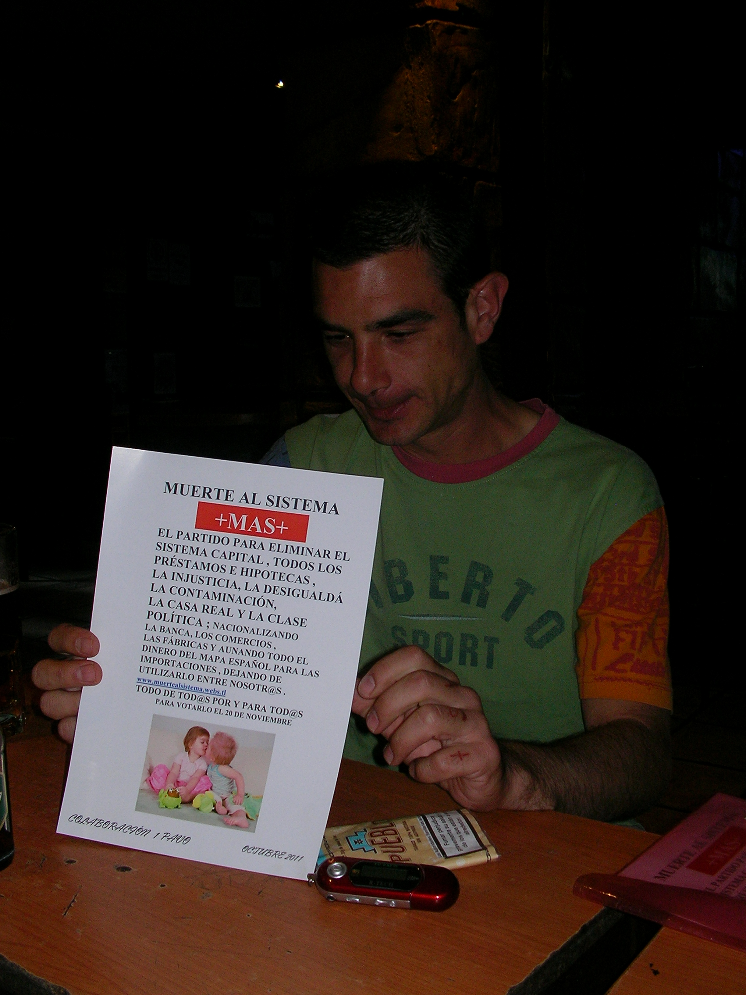 El escenario es el bar Republica de Murcia y de fondo suena la canción ‘Me gustas tú’ de Manu Chao. Frente a nosotros, el cabeza visible del que quizá sea el partido más revolucionario que se presenta a las elecciones del 20-N en la Región de Murcia, ‘Muerte al Sistema’, MAS. Se llama Alberto Saura ‘El lobo de la Alberca’, que a sus 32 años responde al perfil de muchos jóvenes españoles, en paro. Su propósito canalizar sus ideas a través de la política, pensamientos que nos desarrolla a continuación.