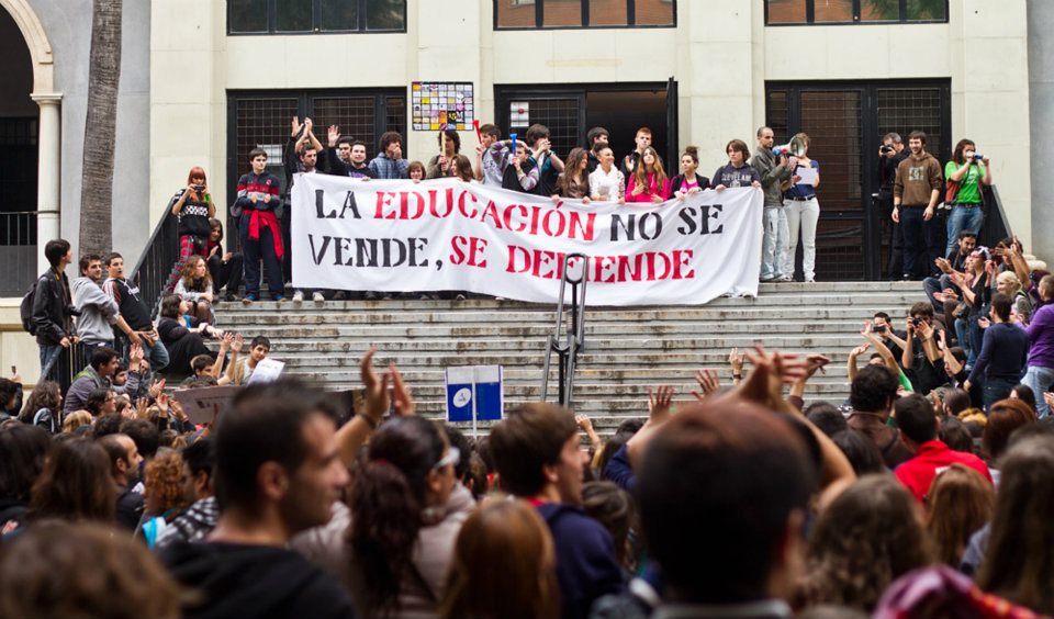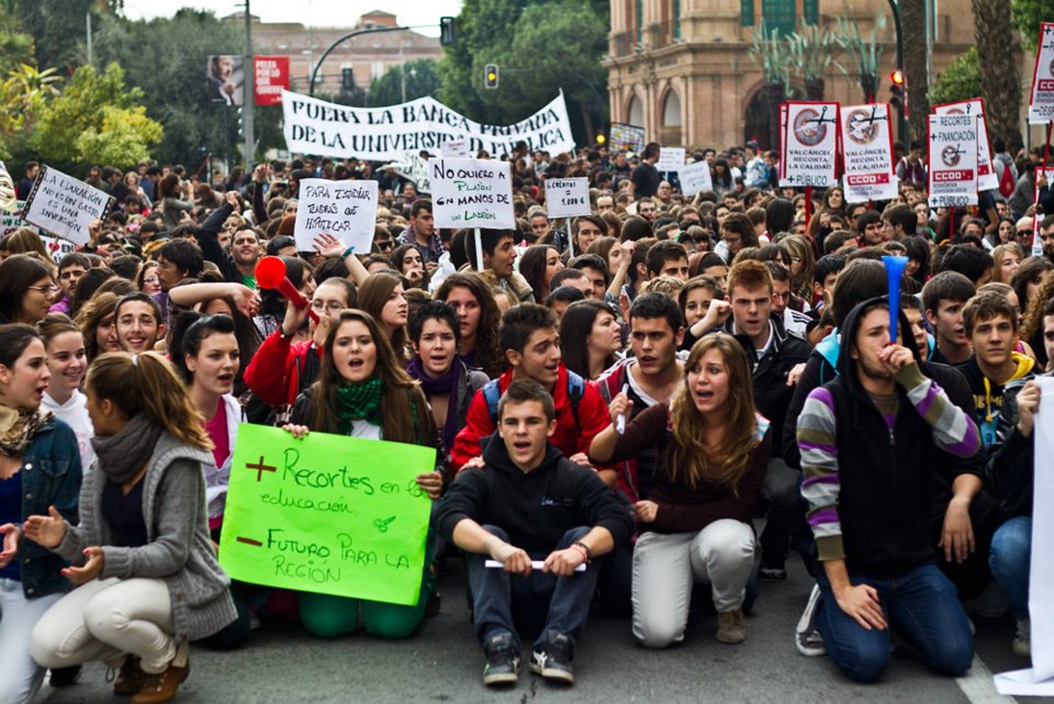 ‘Valcárcel nos vende y el rector lo defiende’, ‘Mientras los políticos se van de fiesta, nuestro futuro se va a la mierda’, ‘Más recortes en la educación, menos futuro para la Región’. Estas son algunas de las consignas de los centenares de jóvenes que se han manifestado esta mañana en Murcia, bajo el lema ‘La educación no se vende, se defiende’. Desde las 12:00 en la plaza de Santo Domingo, la movilización ha transcurrido por la calle Trapería, plaza Cardenal Belluga, avenida Teniente Flomesta y aunque ha concluido en la Merced, la gran protesta se ha producido frente al Rectorado de la Universidad de Murcia.